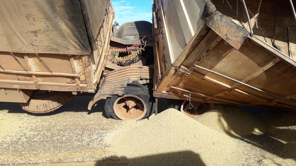 Carreta Bitrem tomba carregada de soja na MT/320 em Colider