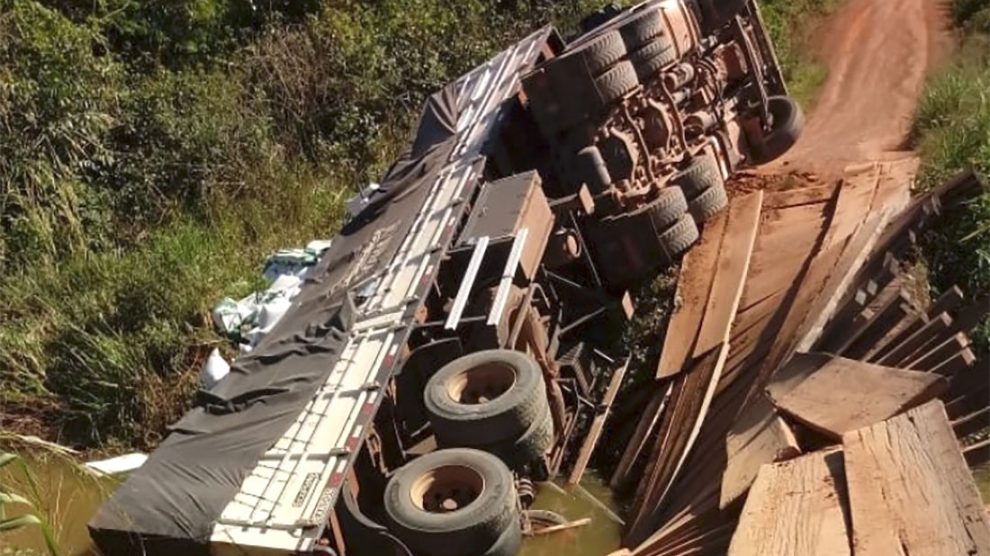 Uma carreta carregada de ração animal tombou ao atravessar um ponte de madeira sobre o corrego Monte Verde. De acordo com moradores, a ponte já apresentava problemas de conservação.