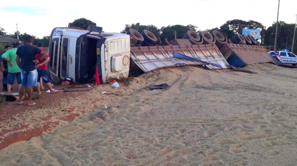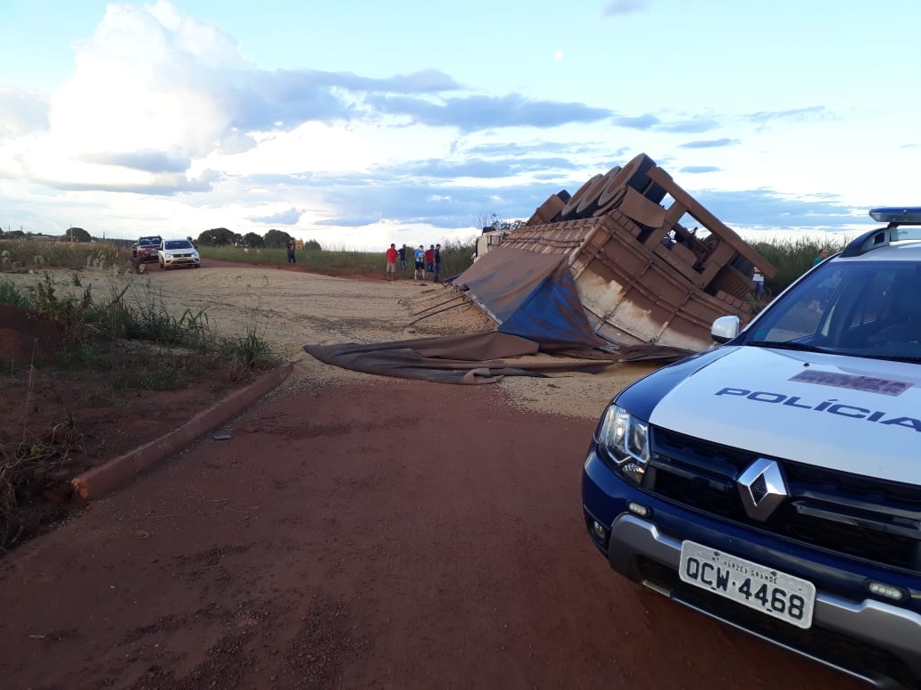 De acordo com informações da Polícia Militar que esteve no local e registrou a ocorrência, a carreta estava fazendo uma curva para entrar na cidade quando o motorista teria pedido o controle e acabou tomando de lado.