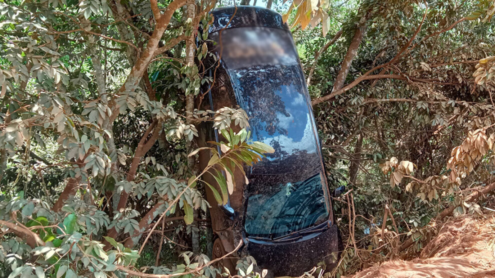 Com o impacto, o carro parou suspenso, com o para-choque no chão e os pneus dianteiros para o ar, além do para-brisa quebrado e lataria danificada.