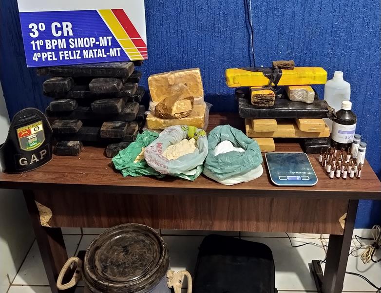 Policiais militares da Patrulha Rural do 11º Batalhão apreenderam 32 tabletes, entre maconha e pasta base de cocaína, e prenderam um casal suspeitos por tráfico de drogas, em uma propriedade rural localizada no município de Feliz Natal (510 km de Cuiabá).
