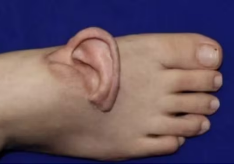 Os médicos conseguem reimplantar a orelha, através de um enxerto no pé – Foto: Dumireo
