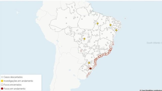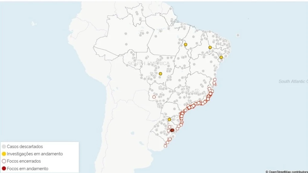 Mapa do monitoramento dos focos de gripe aviária no Brasil
