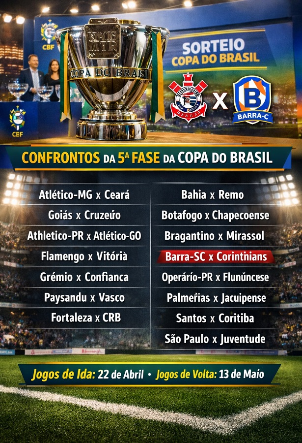 O Corinthians, atual campeão da competição, terá pela frente o Barra, equipe que conquistou a edição 2026 do Campeonato Catarinense. Outros destaques são os confrontos que colocam frente a frente equipes da Série A: Flamengo x Vitória, Bahia x Remo, Botafogo x Chapecoense, Bragantino x Mirassol e Santos x Coritiba.