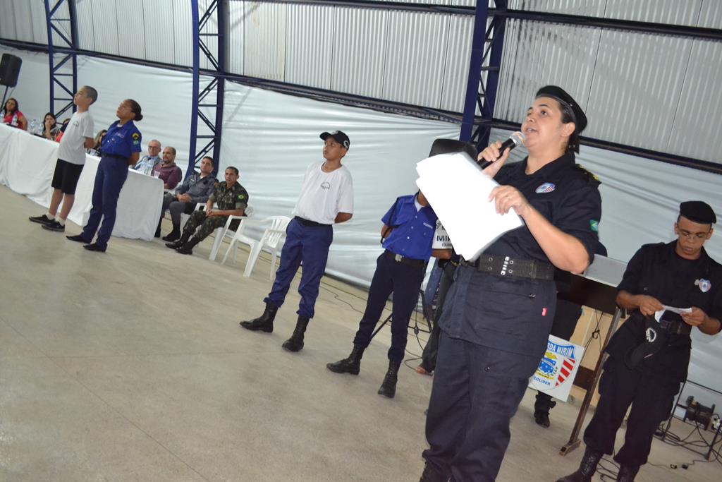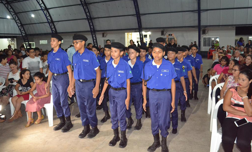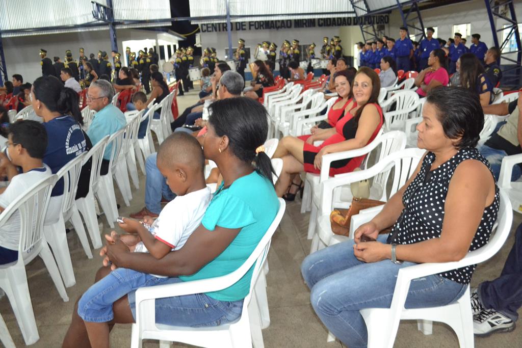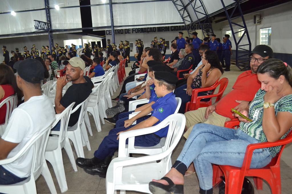 A quadra de Ginásio Esportivo da instituição superlotou pelos novos Cidadãos do Futuro que acompanhados por seus pais compareceram para aula inaugural e na oportunidade puderam conhecer um pouco sobre GM através de apresentação feita pela Presidente Margarida Gaona, fazendo breve explanação dos principais capÃtulos do Estatuto da entidade; alguns esclarecimentos da parte da Comandante Coronel Genislei Barretos sobre a formação e conduta do aluno, e exposição de parte dos projetos de geração de renda executados pela Guarda Mirim, cujo trabalho é desenvolvido por voluntários e alguns servidores, os quais foram apresentados ao público presentes.