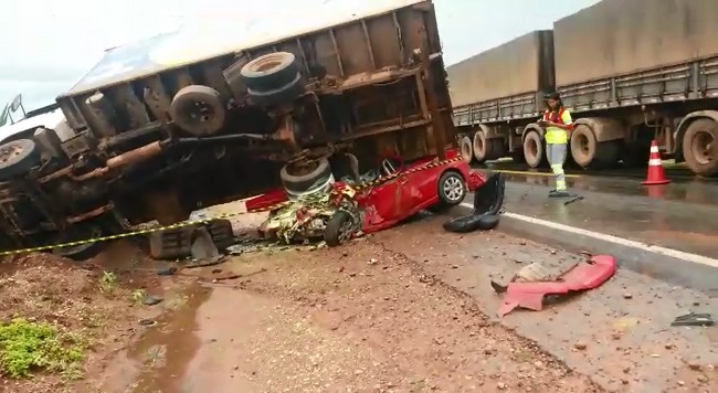 A Policia Rodoviária Federal acaba de confirmar ao site Mutum Noticias que cinco pessoas que estavam no Fiat Pálio vermelho placas NUA 0995 de Sorriso, morreram depois que um caminhão baú tombou por cima do veÃculo, vinda a esmagar o carro.    Â