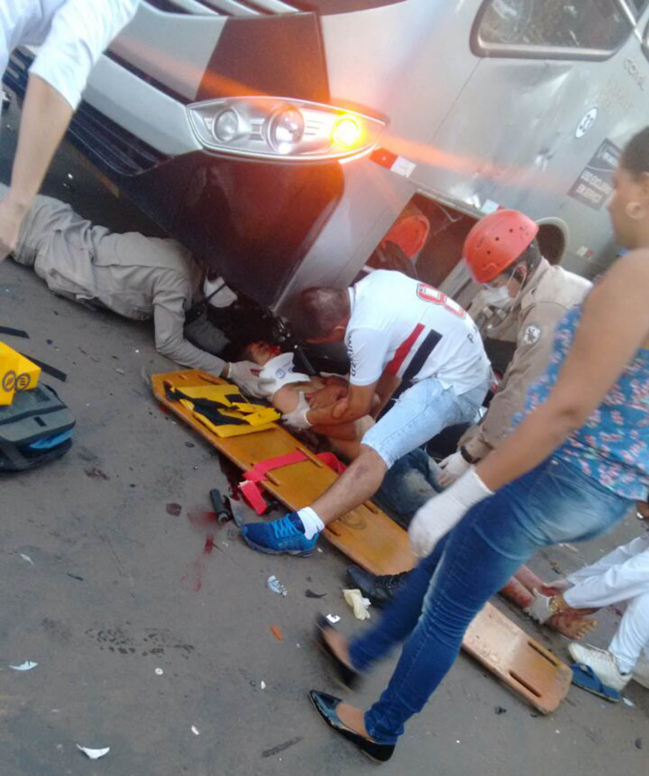 Acidente ocorrido na por volta das 18:40h desta terça-feira(12), na rotatória da Avenida Dauri Riva com José Luiz da Silva, esquina com  a Escola Fábio Ribeiro, em Colider, envolvendo uma moto com duas pessoas, e um ônibus da Prefeitura de Nova Canaã do Norte, os quais colidiram frontalmente,   sendo um  motociclista retirado de debaixo do ônibus