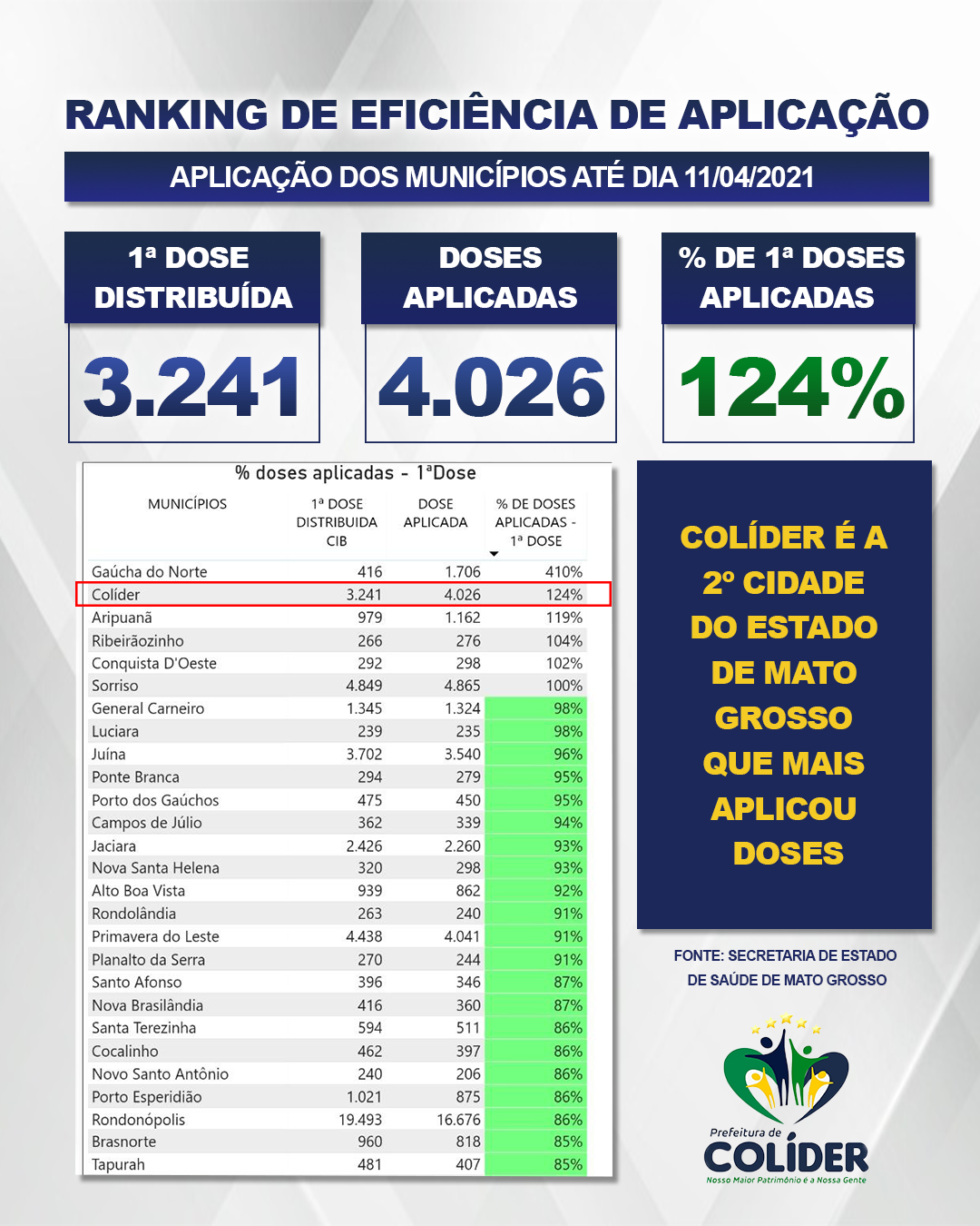 Colíder é mais de 100% e tem atingido a finalidade da vacinação nesta pandemia. Já foram aplicadas, somadas à vacinação dos indígenas, 4.026 doses, sendo 3.241 da primeira dose aplicada.