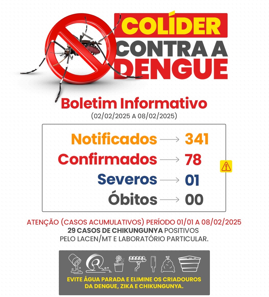 A Prefeitura Municipal de Colíder por meio da Secretaria Municipal de Saúde intensificou as ações de combate ao mosquito da dengue. A Prefeitura reforça a importância do apoio da população no combate à dengue, já que maior parte dos casos de dengue estão dentro das residências.