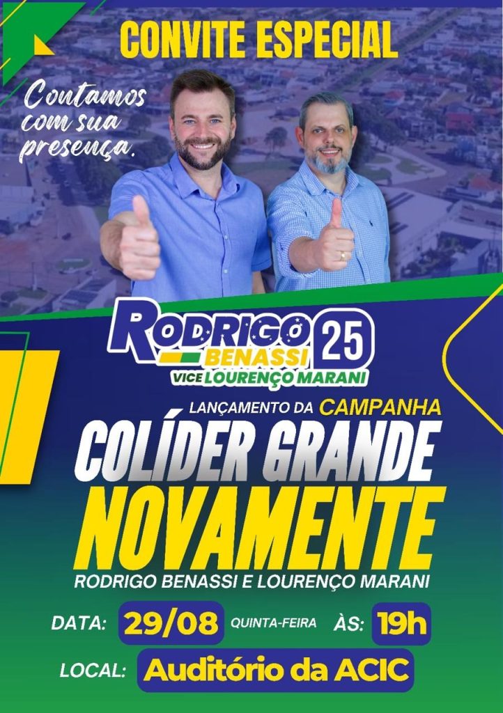 Nesta quinta-feira (29), acontecerá a cerimônia de lançamento oficial da campanha de Rodrigo Benassi para a Prefeitura Municipal de Colíder. Benassi concorre pelo partido PRD (Partido Renovação Democrática) e tem como vice-prefeito na chapa única, intitulada “Colíder Grande Novamente”, o ex-secretário municipal Lourenço Marani (PRD).