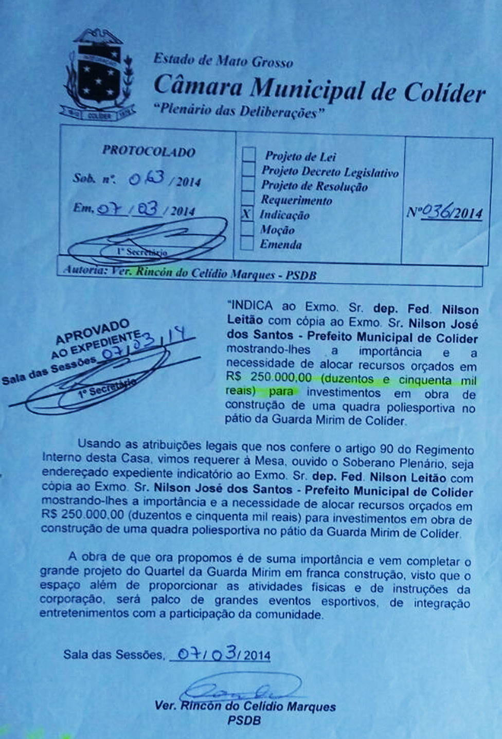 Emenda do deputado federal Nilson Leitão, através de Requerimento do vereador Odair André (Rincon), a Quadra Poliesportiva do Centro de Formação Mirim Cidadão do Futuro, foi recentemente lançada. A obra do valor de R$ 360,00 mil, sendo R$ 260,00 oriundo do Ministério do Esporte, com contra partida da Prefeitura Municipal de Colider no valor de R$ 100,00, tem o prazo de 150 dias para a sua conclusão, ou seja, março de 2017.Â