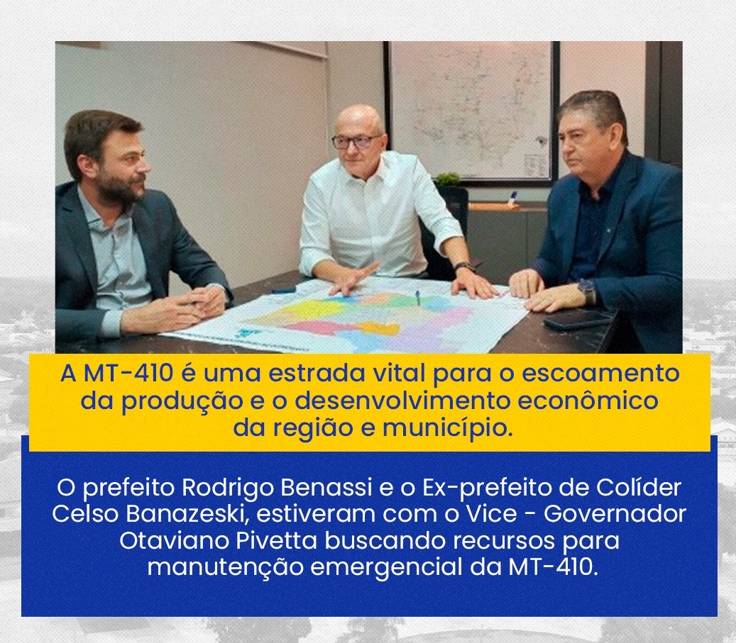 O prefeito Rodrigo Benassi destaca: “Melhorar a infraestrutura é incentivar o crescimento econômico do município, pois somos uma região pujante, facilitaremos o escoamento de grãos e o comércio de bens e serviços entre os municípios. Nessa empreitada o apoio do Ex- prefeito de Colíder Celso Banazeski, tem sido primordial”.