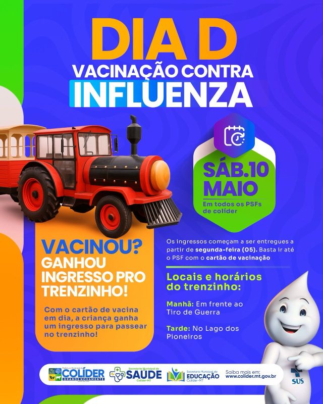 A Prefeitura de Colíder realiza no sábado (10/05) o Dia D de vacinação contra a influenza, com atendimento em todas as unidades de saúde do município. A mobilização tem como objetivo ampliar a cobertura vacinal e proteger a população contra o vírus da gripe.