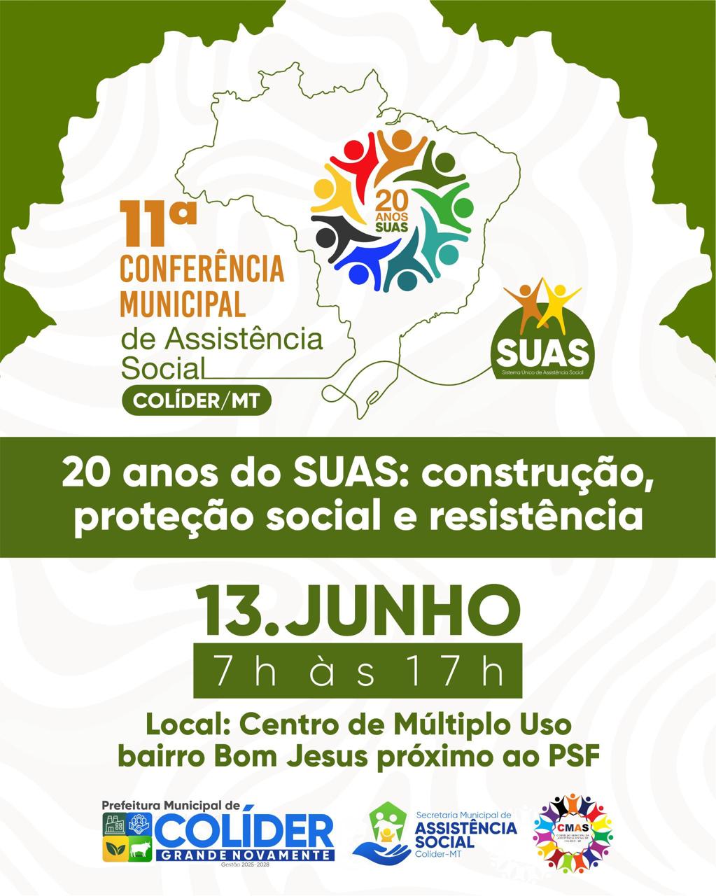 A Prefeitura de Colíder, por meio da Secretaria Municipal de Assistência Social e do Conselho Municipal de Assistência Social (CMAS), promove no dia 13 de junho, a 11ª Conferência Municipal de Assistência Social, com o tema “20 anos do SUAS: construção, proteção social e resistência”.