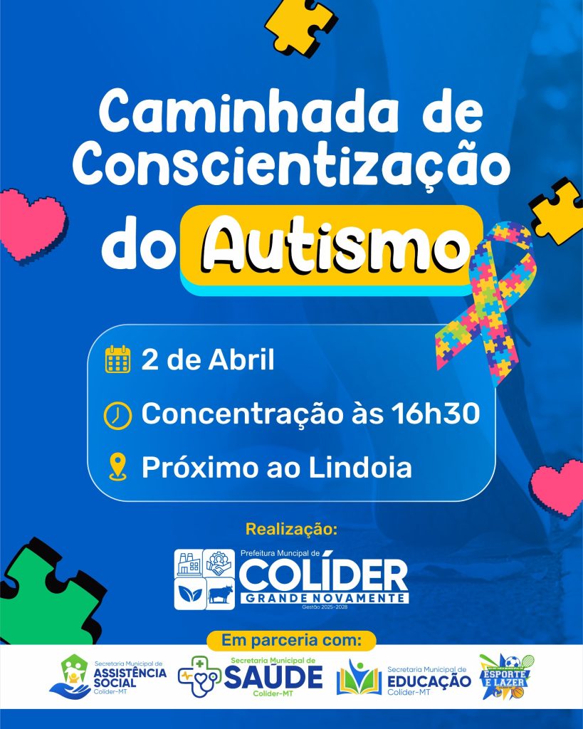 No dia 2 de abril, a Prefeitura de Colíder promoverá a Caminhada de Conscientização do Autismo, em alusão ao Dia Mundial de Conscientização do Autismo. O evento acontecerá com concentração a partir das 16h30, próximo ao Lindoia.