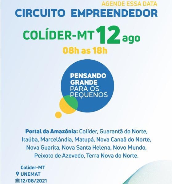 Na próxima semana, Colíder irá sediar a quinta edição do projeto Circuito Empreendedor, no dia 12 de agosto, das 8h às 18h, no campus da Universidade do Estado de Mato Grosso (Unemat) do município.O evento é realizado pela Secretaria de Estado de Desenvolvimento Econômico de Mato Grosso (Sedec-MT) sob a coordenação da Secretaria Adjunta de Desenvolvimento do Ecossistema Empreendedor e apoiado pela prefeitura de Colíder, através da Secretaria Municipal de Indústria e Comércio.