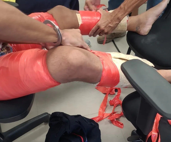 Durante a abordagem eles já confessaram que estavam fazendo o transporte da substância amarrada às pernas. Depois de retiradas, as embalagens que estavam presas em fitas pesaram quase 11 kg de cocaína.