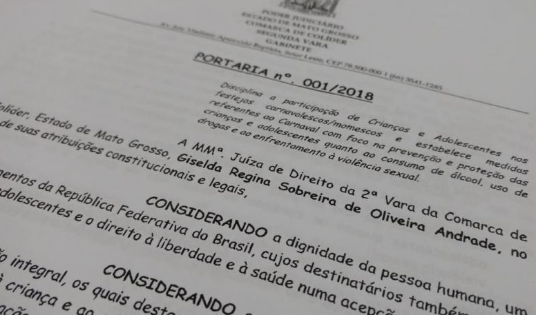 A Câmara de ColÃder recebeu nesta sexta-feira (09.02) cópia da portaria assinada pela juÃza da Segunda Vara CÃvel da Comarca de ColÃder, Giselda Regina Sobreira de Oliveira Andrade, que disciplina a participação de crianças e adolescentes até 18 anos nos eventos de carnaval e estabelece medidas de prevenção ao consumo de álcool, uso de drogas e exploração infantil.