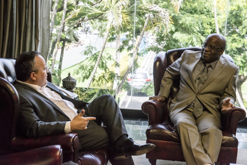 O governador Pedro Taques recebeu na sexta-feira (10.04) a visita do ex-ministro do Supremo Tribunal Federal (STF), Joaquim Barbosa, em seu gabinete, no Palácio Paiaguás. Na oportunidade, o chefe do Poder Executivo apresentou ao ex-presidente da Suprema Corte as medidas adotadas nos 100 primeiros dias de gestão para o combate à corrupção.