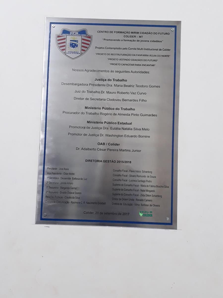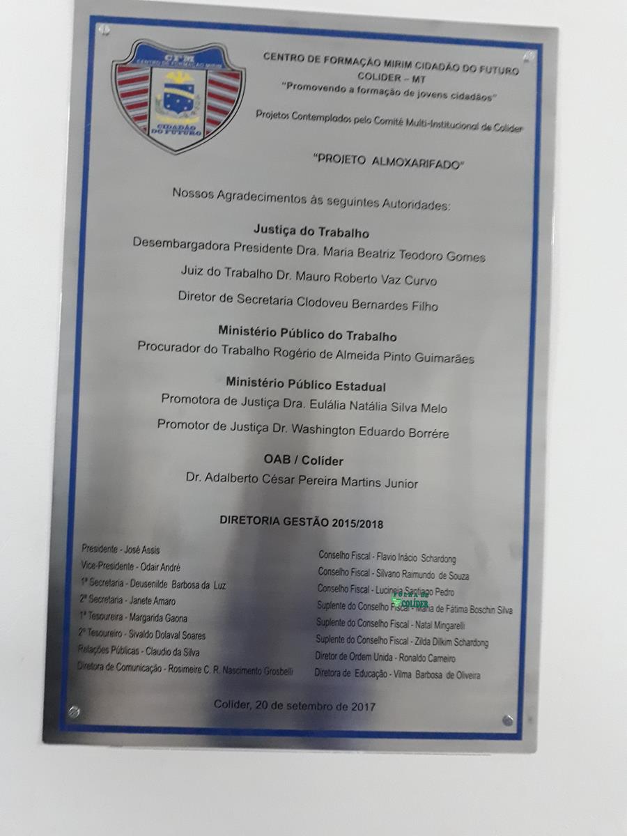 Autoridades diversas como secretários municipais, vereadores, representantes de segmentos sociais; representante do serviço militar e outras prestigiaram na noite da quarta-feira (20-09)a inauguração de cinco importantes projetos, tais como: Horta Cultivando Saúde, Laboratório de Informática, Capacitar para Encantar(Banda, Instrumentos e Uniformes), Almoxarifado e Panificadora,  aprovados pelo Comitê Multi-institucional de Justiça de Colider, composto pela Justiça do Trabalho na representação do Juiz Dr. Mauro Vaz Curvo e seu assessor  Clodoveu Barnardes Filho; Ministério Público do Trabalho, através do procurador Rogério de Almeida Pinto Guimarães; Ministério Público Estadual, através dos promotores de Justiça Dra Eulália Natália Silva Melo  e Dr. Washington Eduardo Borrére,  e  OAB Colider, através de Adalberto Cesar Martins Júnior .