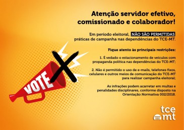 O Tribunal de Contas de Mato Grosso (TCE-MT) promove campanha interna alertando os servidores sobre a vedação de práticas de campanha eleitoral nas dependências do Tribunal de Contas.