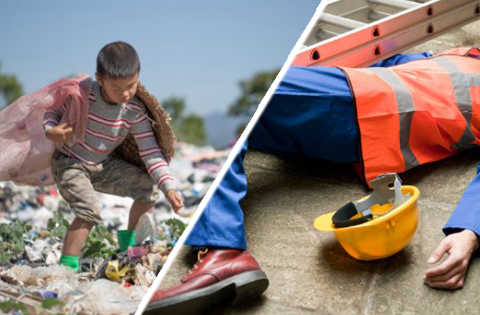 Foto dividida ao meio na diagonal. Na metade de cima, criança catando lixo; na parte inferior, trabalhador caído no chão