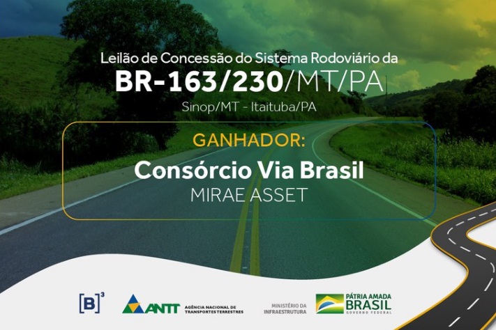 O consórcio Via Brasil venceu hoje (8), na B3, a bolsa de valores de São Paulo, o leilão de um trecho de cerca de mil quilômetros de rodovia que liga Mato Grosso até a Hidrovia do Tapajós (BR-163 e BR-230). Único concorrente do pregão, o consórcio apresentou oferta de R$ 7,86 de pedágio por 100 quilômetros, valor 8,09% inferior ao preço máximo aceito, de R$ 8,56 por 100 quilômetros.