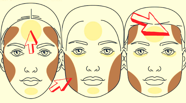 Nesse caso, a sombra ficará nas laterais inferiores do rosto – isso vai diminuir a aparências das bochechas. Para finalizar, ilumine bem o centro da testa e a pontinha do queixo para destaca-los.