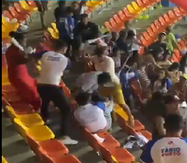 Vídeos que circulam nas redes sociais mostram participantes brigando nas arquibancadas, alguns usando hastes de bandeiras de candidatos nas agressões. Pelas imagens é possível ver pessoas correndo pelas arquibancadas tentando sair do espaço.