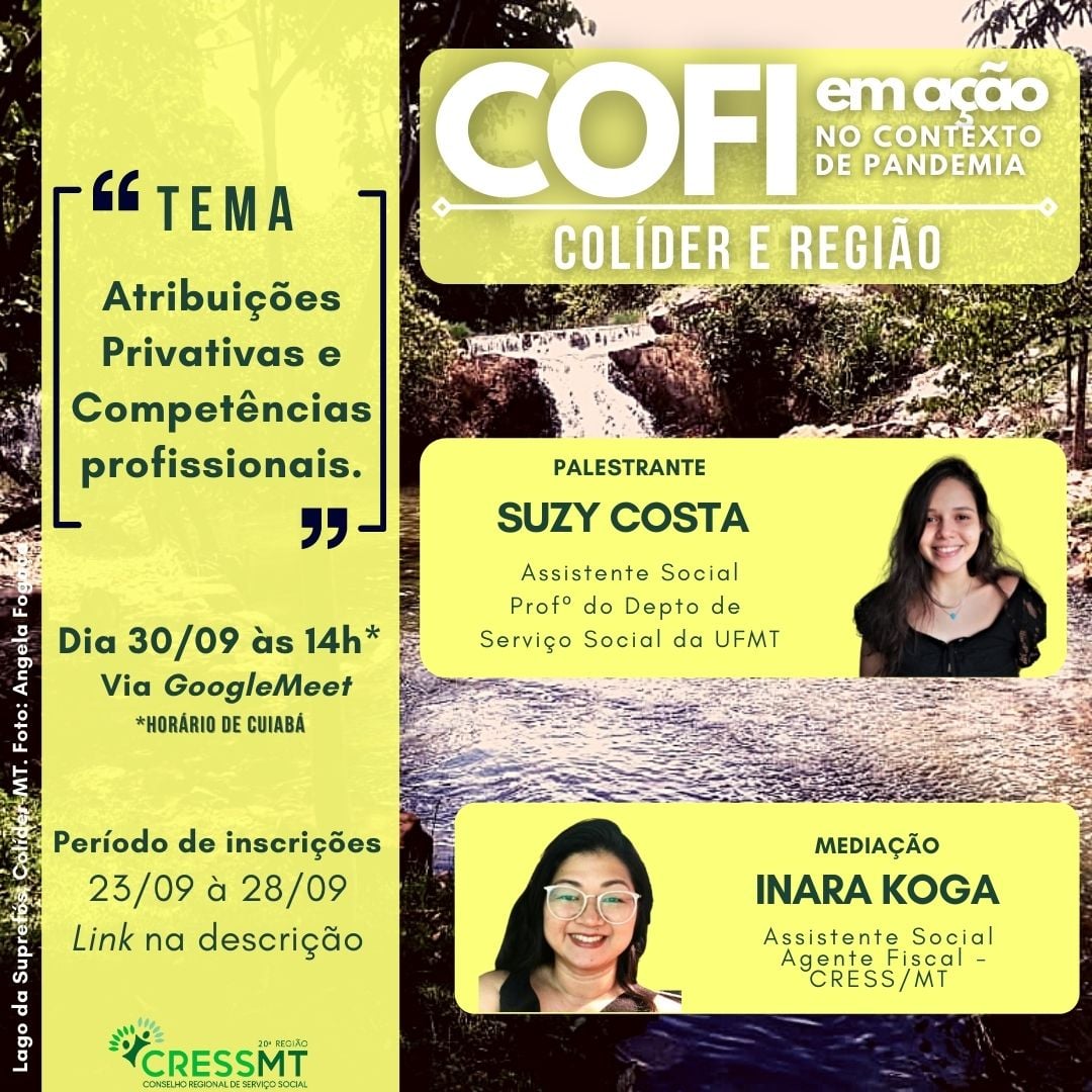 A atividade COFI em Ação, idealizada pelo Setor de Orientação e Fiscalização do CRESS/MT, tem por objetivo, neste ano de 2021, “Desenvolver a ação orientativa do CRESS, na perspectiva da consolidação e fortalecimento do projeto ético-político do Serviço Social”, por meio da discussão sobre o tema “Atribuições Privativas e Competências Profissionais”.