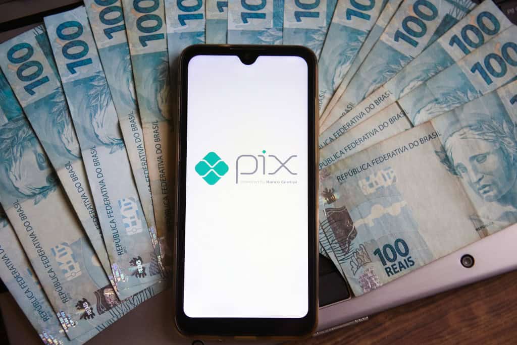 Logo do Pix na tela de um smartphone; debaixo dele, várias notas de R$ 100