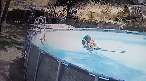 Nas imagens é possível ver o menino correndo em direção a piscina, até que ele pula e começa a nadar em direção a mãe. Após alcançá-la, ele a segura e nada de volta até as escadas. Em seguida, o avô do menino chega para ajudar também.