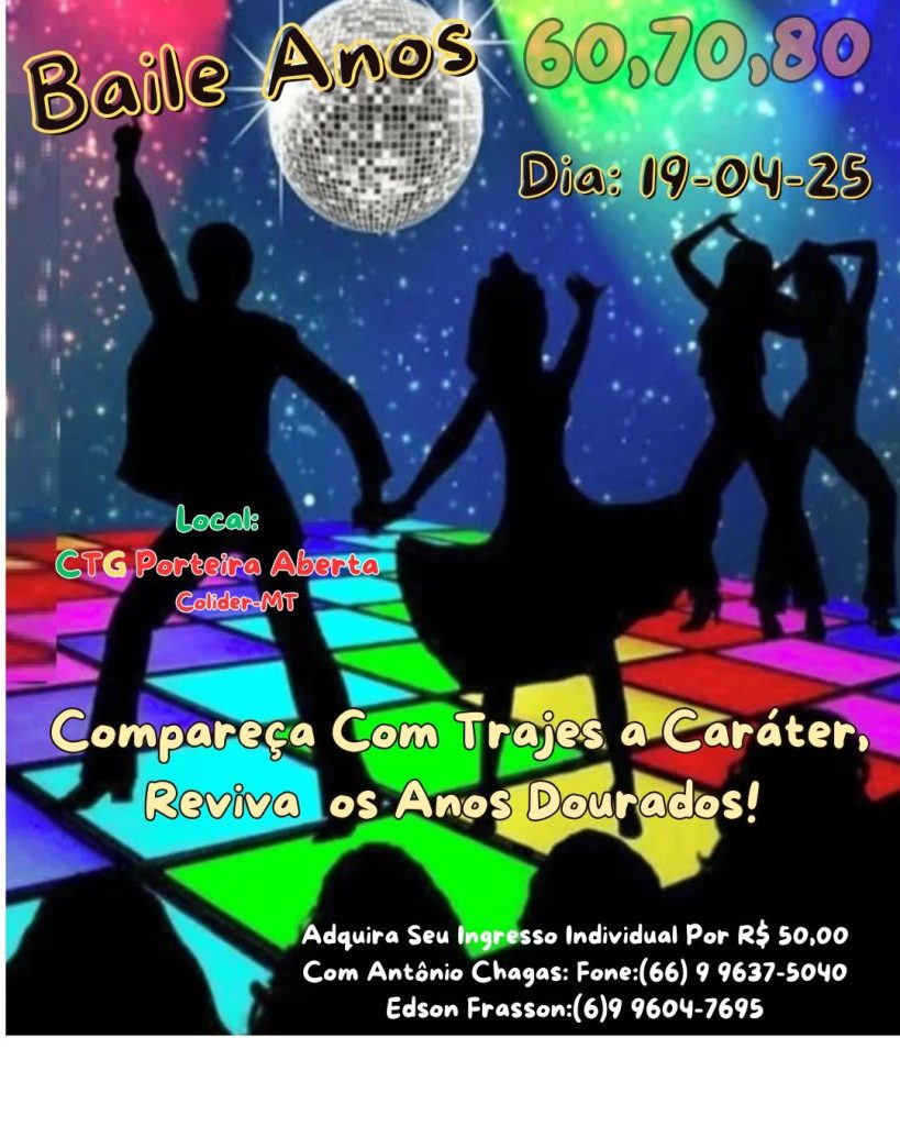O CTG de Colider Oferece Magnífica Noite Com Muita Música, Dança e Lembranças, no dia 19 de abril, com a realização do Baile dos Anos 60, 70 e 80, que acontecerá no Galpão do CTG a partir das 22h. Este evento é uma oportunidade única de reviver os melhores momentos dessas décadas icônicas, repletas de música, dança e boas lembranças.