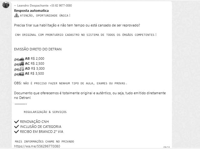 Comunicado que vem sendo divulgado em grupos whatsApp de Colider, da parte de uma certa pessoa com perfil no WhatsApp em nome de Leandro Despachante, oferece o que ele chama de “OPORTUNIDADE ÚNICA” para tirar Carteira Nacional de Habilitação sem necessidade de fazer NENHUM TIPO DE AULA, EXAMES ou PROVAS”, oferecendo CNH Original Com Prontuário Cadastrado no Sistema de Todos os Órgãos Competentes.