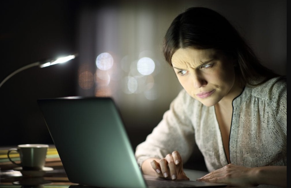 Pessoa desconfiada analisa tela de notebook