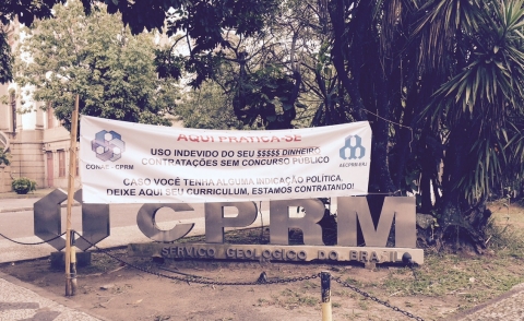A faixa na porta da sede da CPRM, no Rio, é um protesto dos servidores de carreira da empresa pública contra a farra do PT no aparelhamento da companhia, transformada em um dos maiores cabides de emprego do partido, à s custas do contribuinte brasileiro.Â