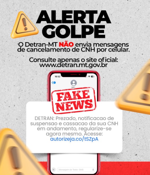 Um novo golpe circula em Mato Grosso e tenta enganar motoristas com um aviso falso de suspensão da Carteira Nacional de Habilitação (CNH). A mensagem afirma que a habilitação foi bloqueada e orienta o condutor a regularizar a situação por meio de um link. O Departamento Estadual de Trânsito de Mato Grosso (Detran-MT), informa que se trata de uma fraude.