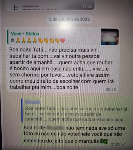 A justificativa era o posicionamento político sobre a questão eleitoral compartilhado pela trabalhadora. “Boa noite Tatá, não precisa mais vir trabalhar tá bom. Vai vir outra pessoa a partir de amanhã… quem acha que roubar é bonito aqui em casa não entra…..vlw….e sem chororô por favor. Voto é livre assim como meu direito de escolher quem irá trabalhar pra mim. Boa noite”, dizia a mensagem.
