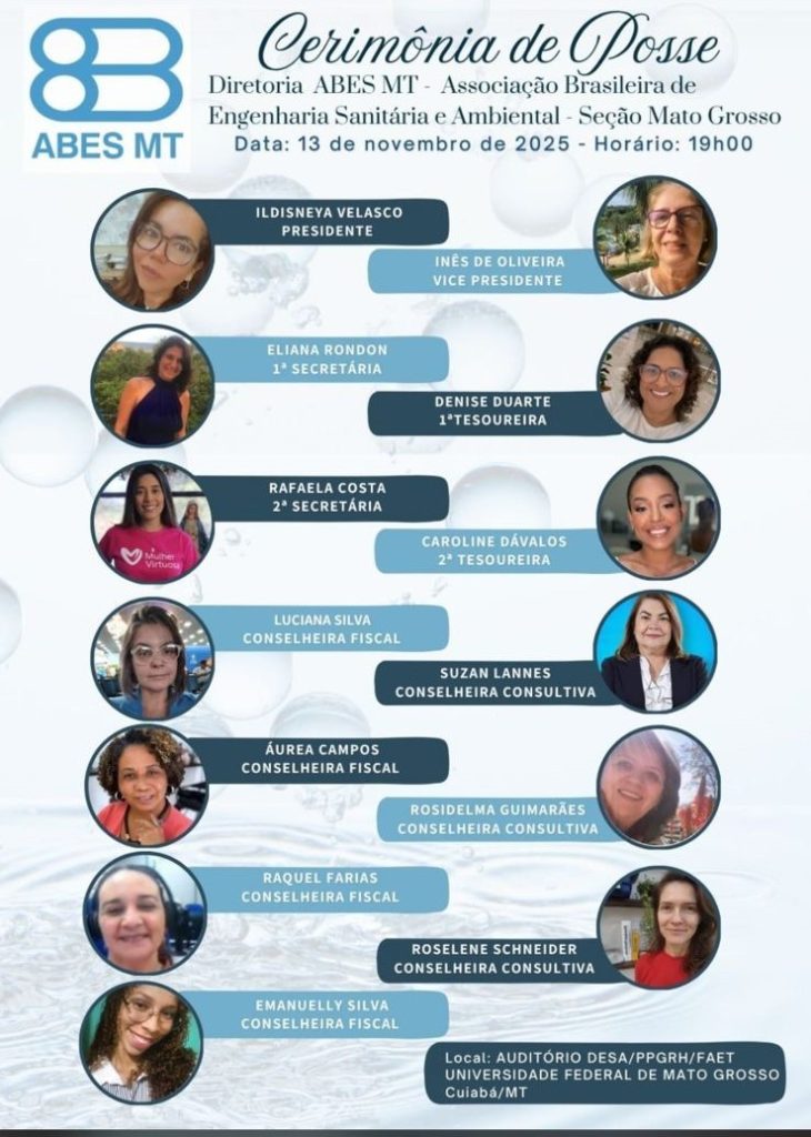 A Associação Brasileira de Engenharia Sanitária e Ambiental – Seção Mato Grosso (ABES-MT) empossou, no dia 13 de novembro de 2025, sua nova diretoria para o biênio 2025–2027, em cerimônia realizada no auditório do DESA/UFMT. Pela primeira vez na história, a entidade será conduzida por uma equipe integralmente feminina, formada por profissionais experientes e atuantes em diversas áreas do saneamento e do meio ambiente.