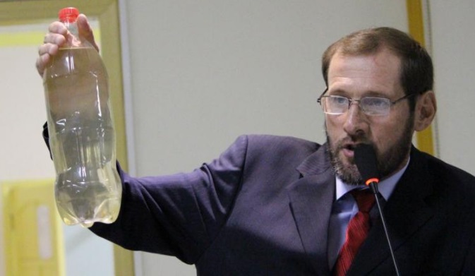 Na sessão desta segunda-feira (09.10), levando consigo uma garrafa plástica cheia de uma água turva coletada no centro da cidade, o parlamentar questionou a qualidade do produto que sai das torneiras.