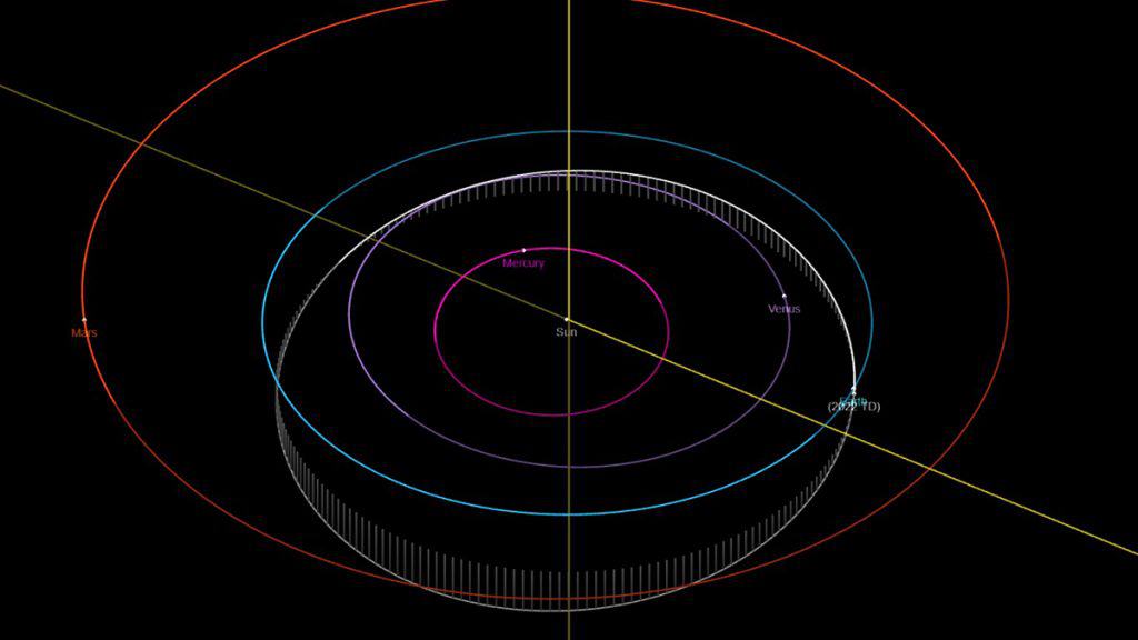 Os asteroides 2023 TG e 2022 TD, cada um com o tamanho médio de um caminhão urbano, têm as órbitas cruzadas com a da Terra nesta sexta (6)