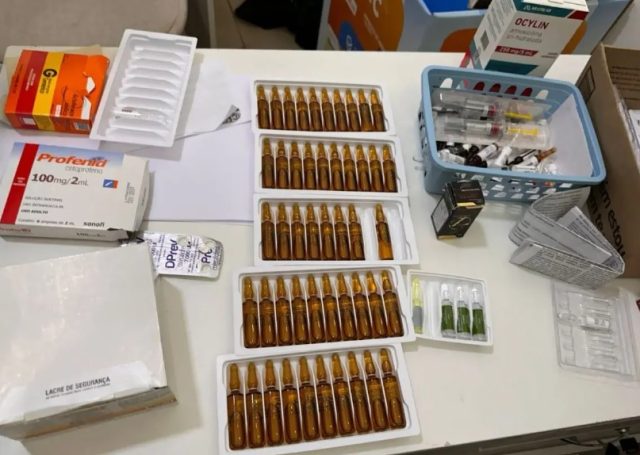 No carro do investigado, policiais encontraram remédios e soros fisiológicos armazenados de forma irregular, sem condições adequadas de temperatura.