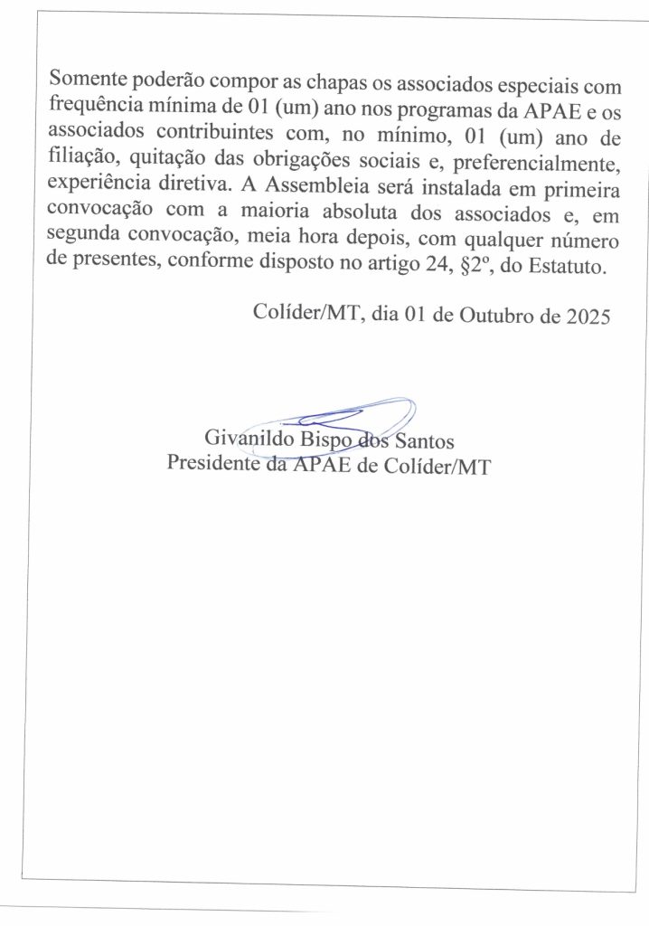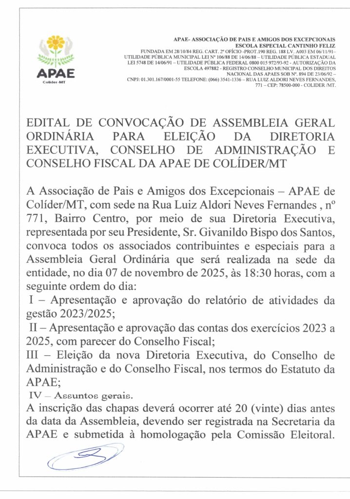 Início Colider Em Evidência EDITAL DE CONVOCAÇÃO DA ASSEMBLEIA GERAL ORDINÁRIA PARA ELEIÇÃO DA DIRETORIA EXECUTIVA,... Colider Em Evidência EDITAL DE CONVOCAÇÃO DA ASSEMBLEIA GERAL ORDINÁRIA PARA ELEIÇÃO DA DIRETORIA EXECUTIVA, CONSELHO DE ADMINISTRAÇÃO E CONSELHO FISCAL DA APAE DE COLÍDER/MT Por Folha de Colíder - 1 de outubro de 2025 668 0 FacebookTwitterPinterestWhatsApp Imagem ilsutrativa destacada/reprodução