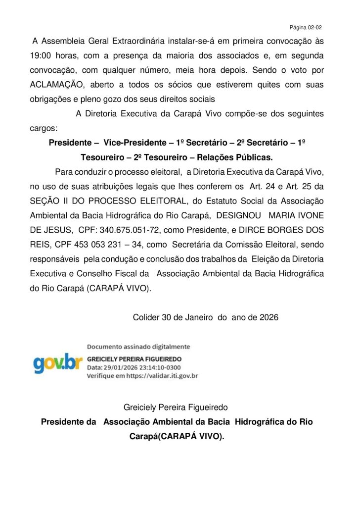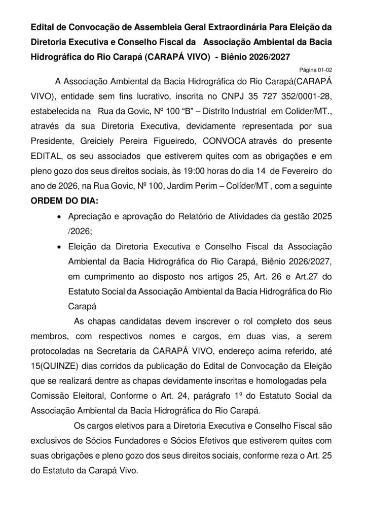 Início Comportamento Edital de Convocação de Assembleia Geral Extraordinária Para Eleição da Diretoria Executiva... Comportamento Edital de Convocação de Assembleia Geral Extraordinária Para Eleição da Diretoria Executiva e Conselho Fiscal da Associação Ambiental da Bacia Hidrográfica do Rio Carapá (CARAPÁ VIVO) – Biênio 2026/2027 Por Folha de Colíder - 30 de janeiro de 2026 46 0 FacebookTwitterPinterestWhatsApp