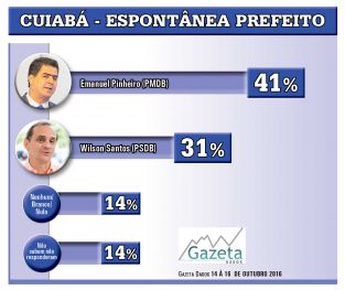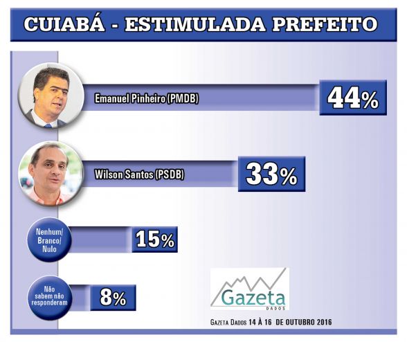 O Instituto Gazeta Dados ouviu 800 eleitores de Cuiabá, entre os dias 14 e 16 de outubro. A margem de erro é de 4 pontos percentuais, para mais ou para menos, e o intervalo de confiança é de 95%, isto é, se fossem realizadas 100 pesquisas, em 95 delas os resultados seriam iguais a estes, considerando a margem de erro. O levantamento foi registrado na Justiça Eleitoral, sob o protocolo MT 07698/2016.