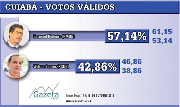 O candidato do PMDB, Emanuel Pinheiro, aparece à frente na primeira rodada de pesquisas do Instituto Gazeta Dados, que foi às ruas para medir a intenção de voto dos eleitores cuiabanos neste segundo turno.