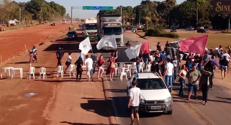 Os servidores da rede estadual de educação, que estão em greve há quase um mês, bloqueiam um trecho da BR-364, em Cuiabá, na manhã desta terça-feira (25).