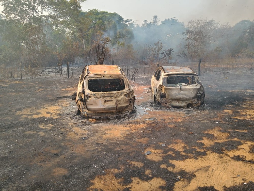 De acordo com o Corpo de Bombeiros, as chamas começaram às margens da MT-251 e avançaram para o estacionamento. Os dois veículos atingidos já estavam destruídos pelo fogo quando as equipes chegaram no local.