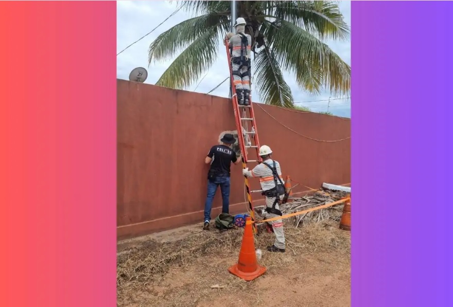 Operados da empresa de energia fazendo o procedimento de corte do “gato”. (Foto: Reprodução)