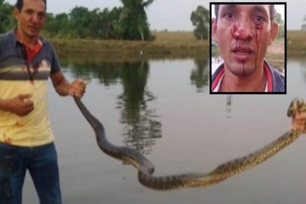 Um empresário de 36 anos sofreu um ataque de uma cobra sucuri de pelo menos 3 metros no último final de semana na represa de uma fazenda localizada a cerca de 70 quilômetros de Juara. Segundo informações, a vÃtima estaria amarrando um barco em tronco quando foi atacado pelo animal que engatou as presas em seu nariz e começou a enrolar no pescoço.
